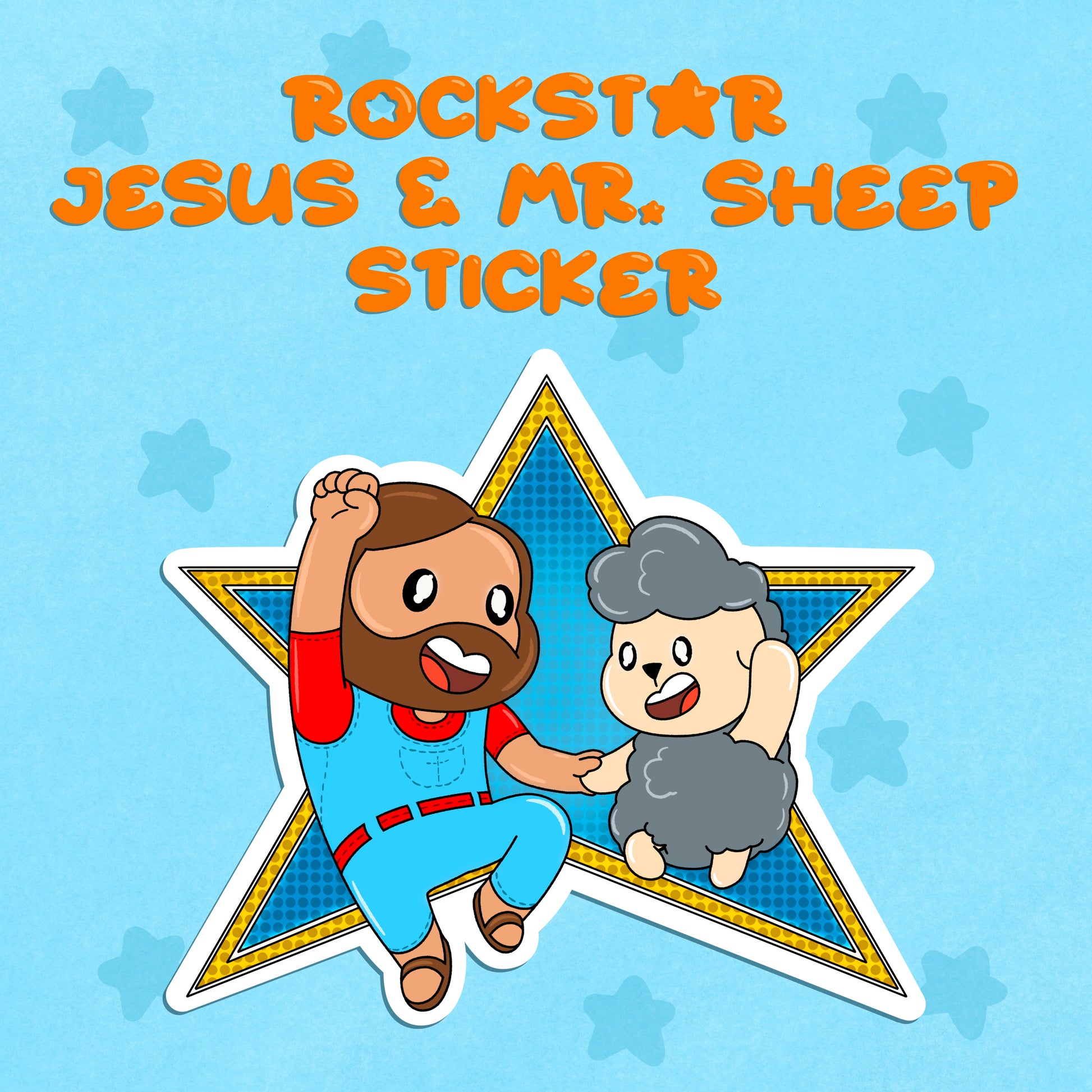 Turn up the joy and let your faith shine loud with this bold and playful Rockstar Jesus & Mr. Sheep sticker! Featuring Jesus and Mr. Sheep mid-jump in front of a glowing star backdrop, this design captures pure energy, friendship, and celebration. It’s a fun reminder that faith isn’t just quiet, it can be vibrant, exciting, and full of life.