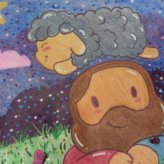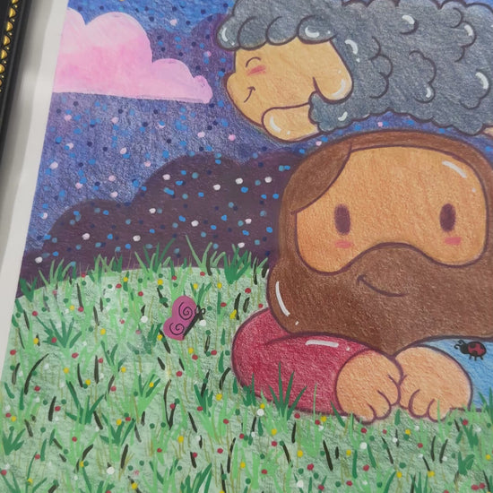 This piece captures Jesus resting gently under a glowing night sky, laying on His stomach and looking toward you with calm, loving eyes, while Mr. Sheep joyfully leaps over Him in pure, childlike freedom. Surrounded by soft stars and a glowing moon, the entire scene feels like a quiet reminder of peace, protection, and trust.