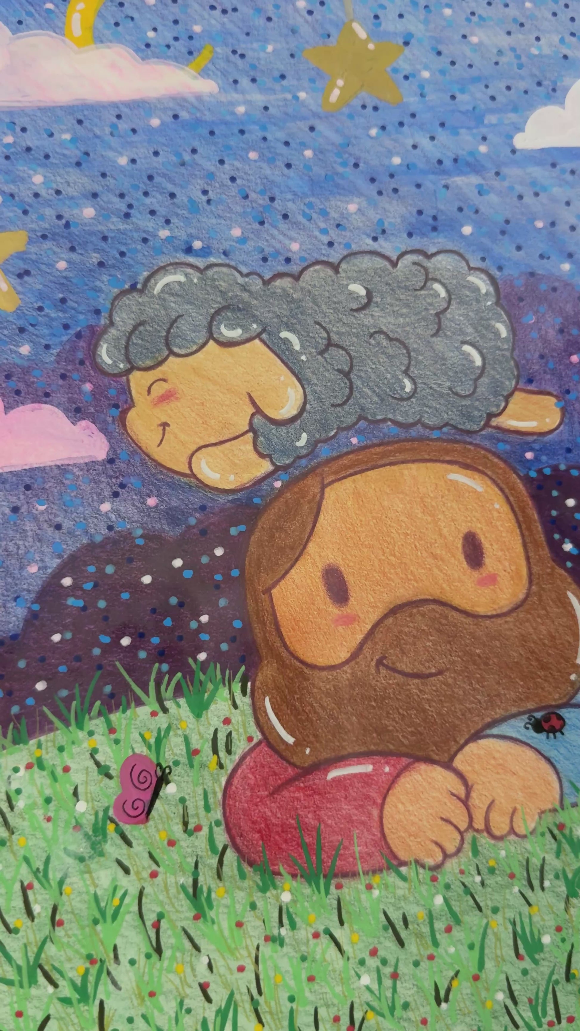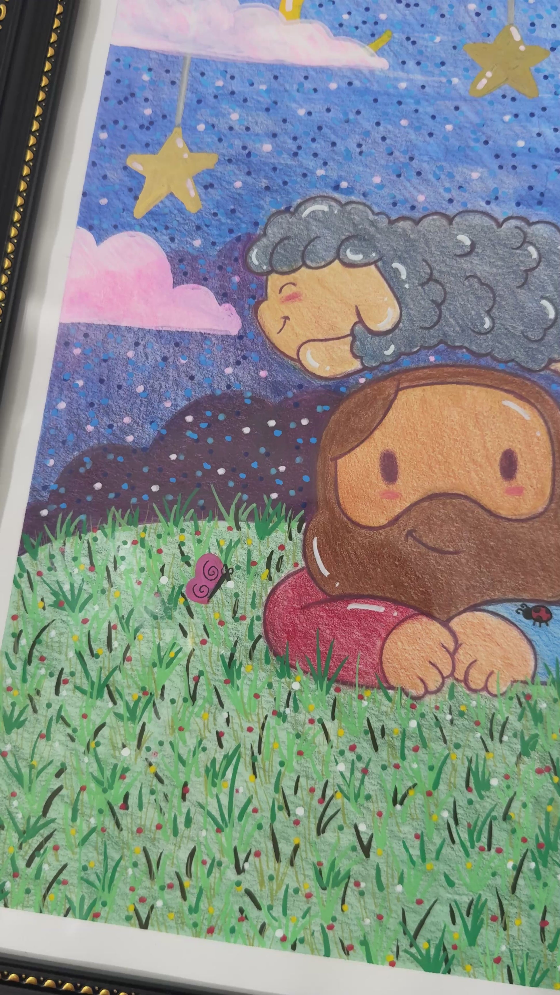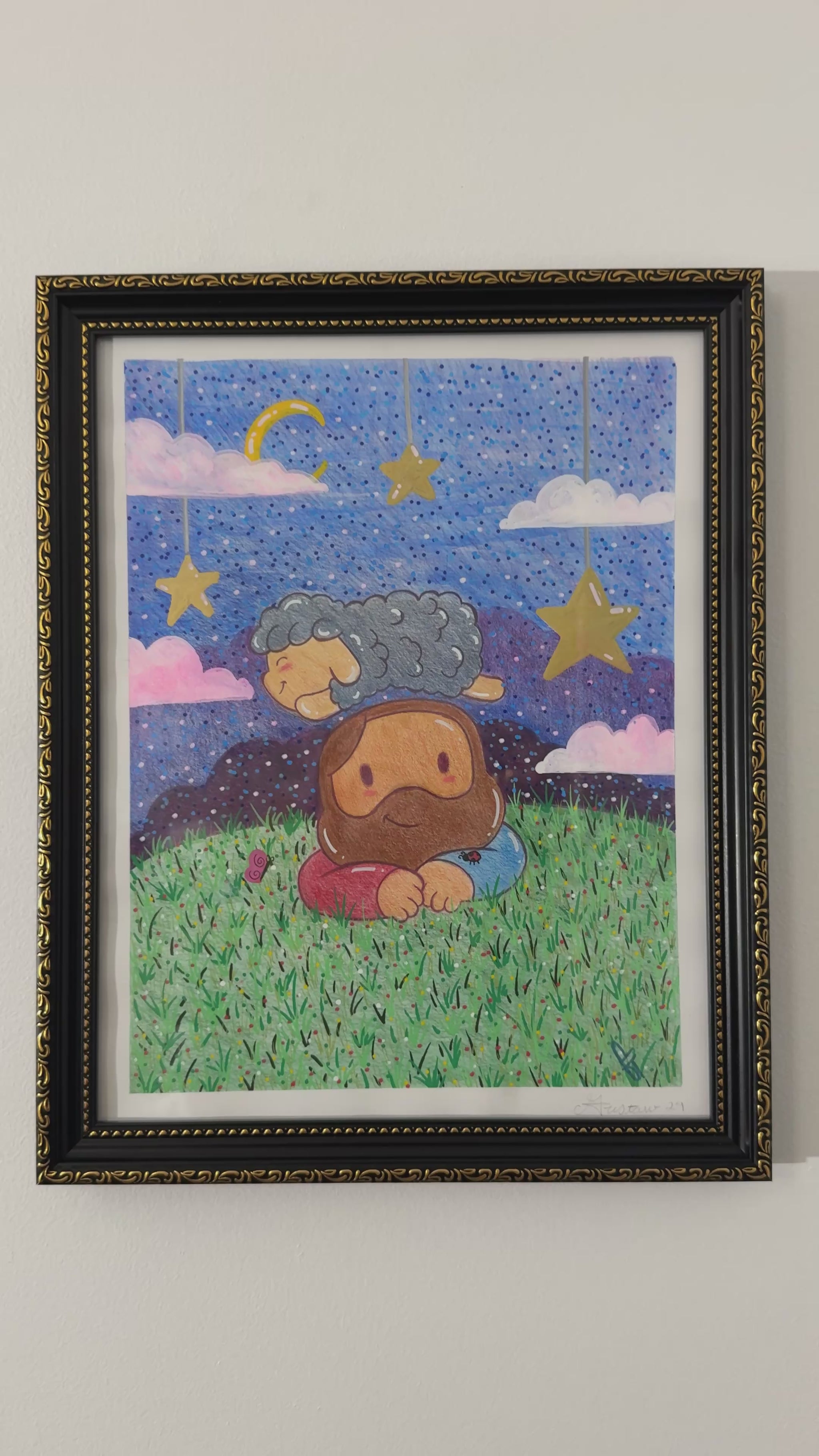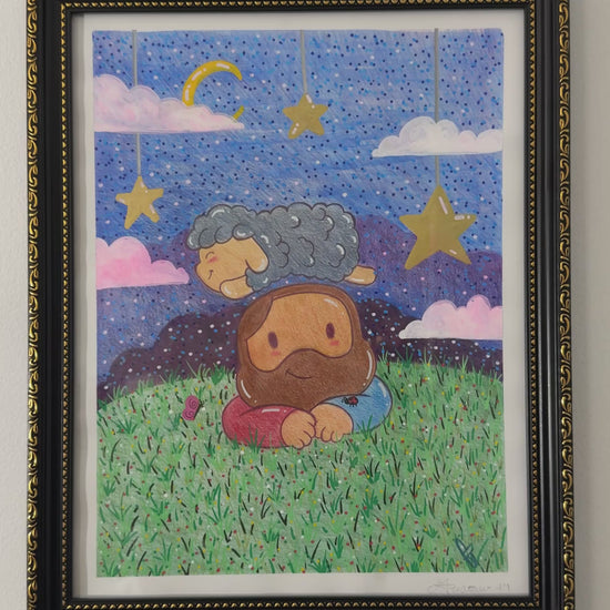 Dreamy Night with Jesus & Mr. Sheep Original Artwork (Picture Frame Included)